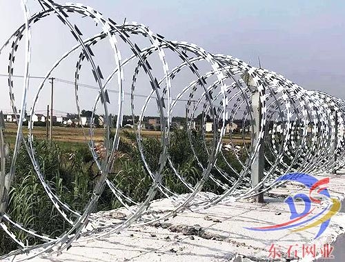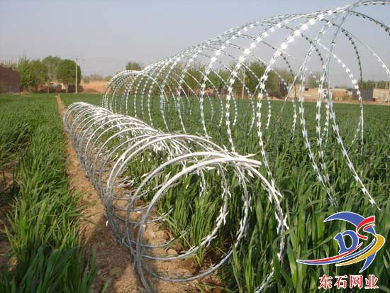 刀片刺網(wǎng)又名蛇腹網(wǎng)或刮刀型刺網(wǎng),是一種近年來防護(hù)、隔離能力較強(qiáng)的新型產(chǎn)品。 刀片用及耐腐蝕性的熱鍍鋅鋼板或不銹鋼板做材料,由專用機(jī)械強(qiáng)力包附與熱鍍鋅高碳鋼絲或不銹鋼絲做的芯線上。由于有著鋒利美觀的刀片刺、高強(qiáng)度的芯線,使本產(chǎn)品綜合了防阻效果好、難破壞、安裝美觀方便快捷、耐老化等諸多優(yōu)點(diǎn)。